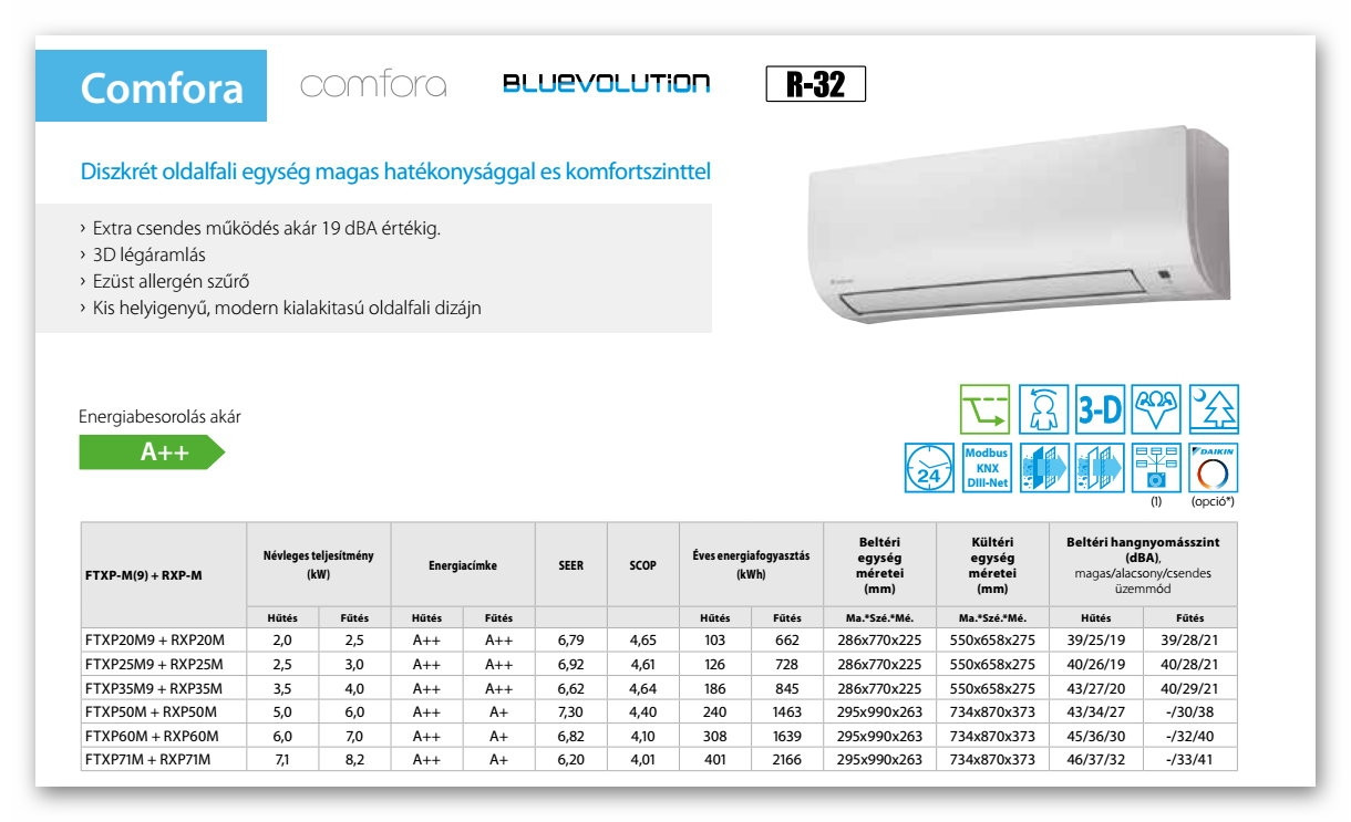 A Daikin FTXP50N / RXP50N Comfora Inverteres Split klíma fontos tulajdonságai: